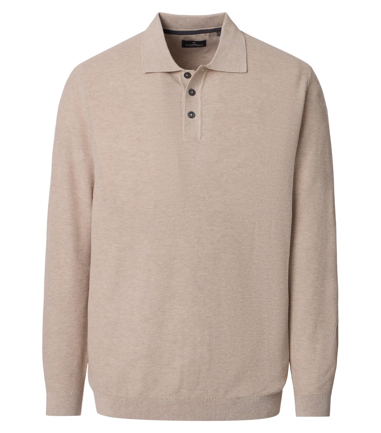 Deze Casa Moda herenpolo met lange mouwen in een beige tint is een comfortabele en veelzijdige keuze. Gemaakt van 100% katoen in een basic circular knit, biedt hij een zachte feel en een tijdloze uitstraling. De klassieke polokraag en het effen design maken dit item ideaal voor een verzorgde, casual look.